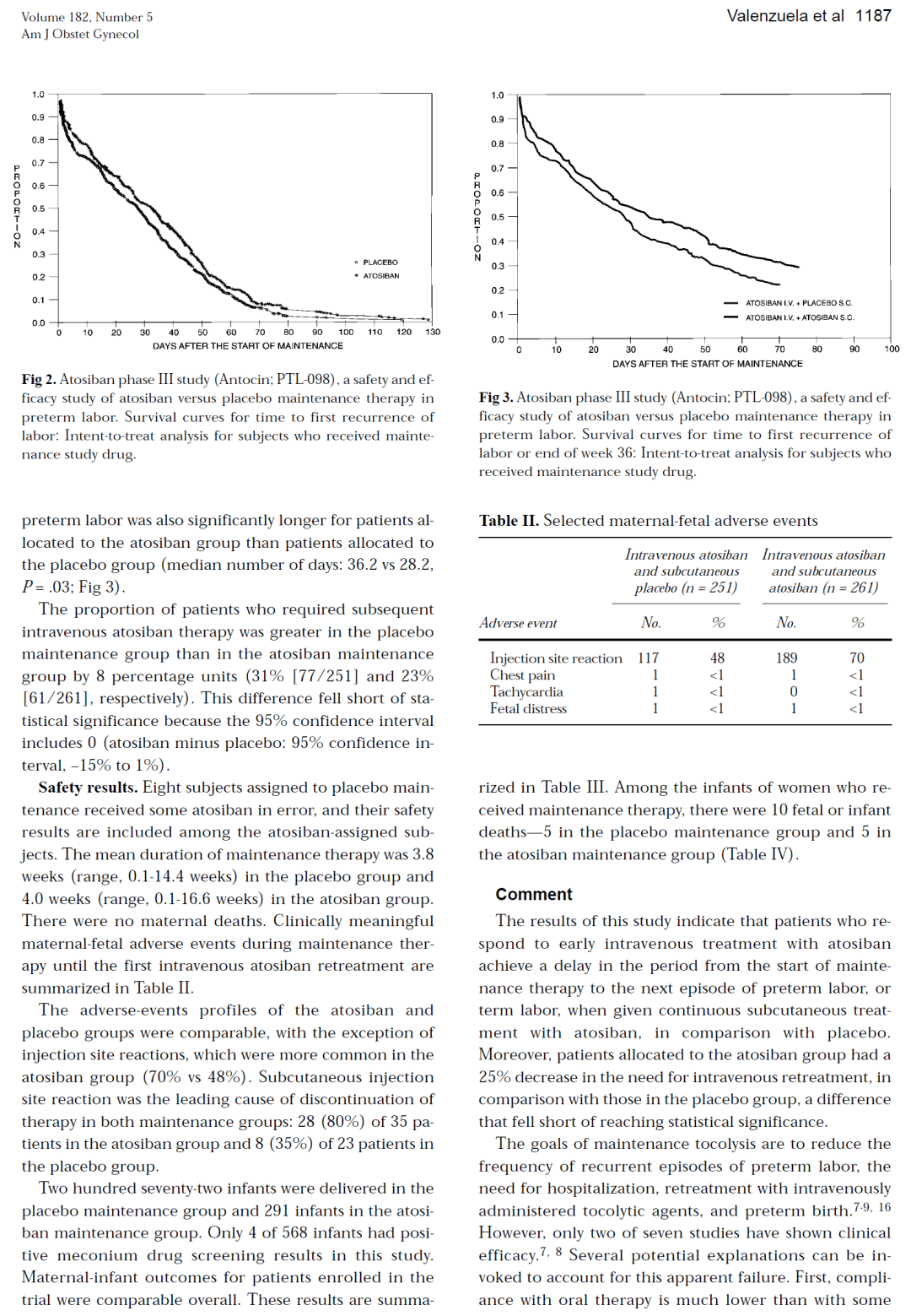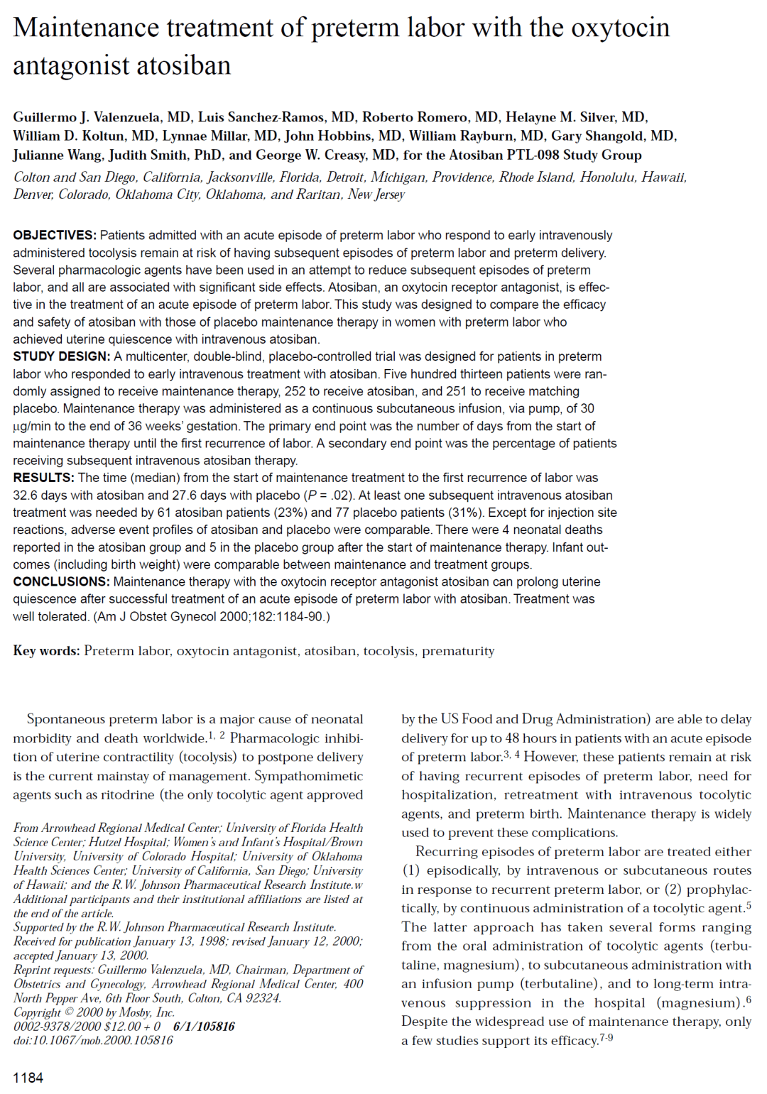 目的: 本研究旨在比较阿托西班与安慰剂的维持治疗在早产妇女静脉注射阿托西班后使子宫平静的疗效和安全性。研究设计: 一项围绕对阿托西班的早期静脉注射有反应的早产患者设计的多中心、双盲、安慰剂对照试验。共有513名患者接受维持治疗,252名患者接受阿托西班维持治疗,251名患者接受安慰剂维持治疗。维持治疗通过泵持续皮下输注30微克/分钟至妊娠36周结束。结果: 阿托西班组可将子宫静息期延长32.6天(中位数),安慰剂组为27.6天(P=.02)。除注射部位反应外,阿托西班和安慰剂的不良事件分布是可比的。婴儿结果(包括出生体重)在维持组和治疗组之间具有可比性。 结论:催产素受体拮抗剂阿托西班维持治疗能延长阿托西班成功治疗早产急性发作后的子宫静息期。治疗耐受性良好。(美国妇产科杂志2000;182:1184-90.)