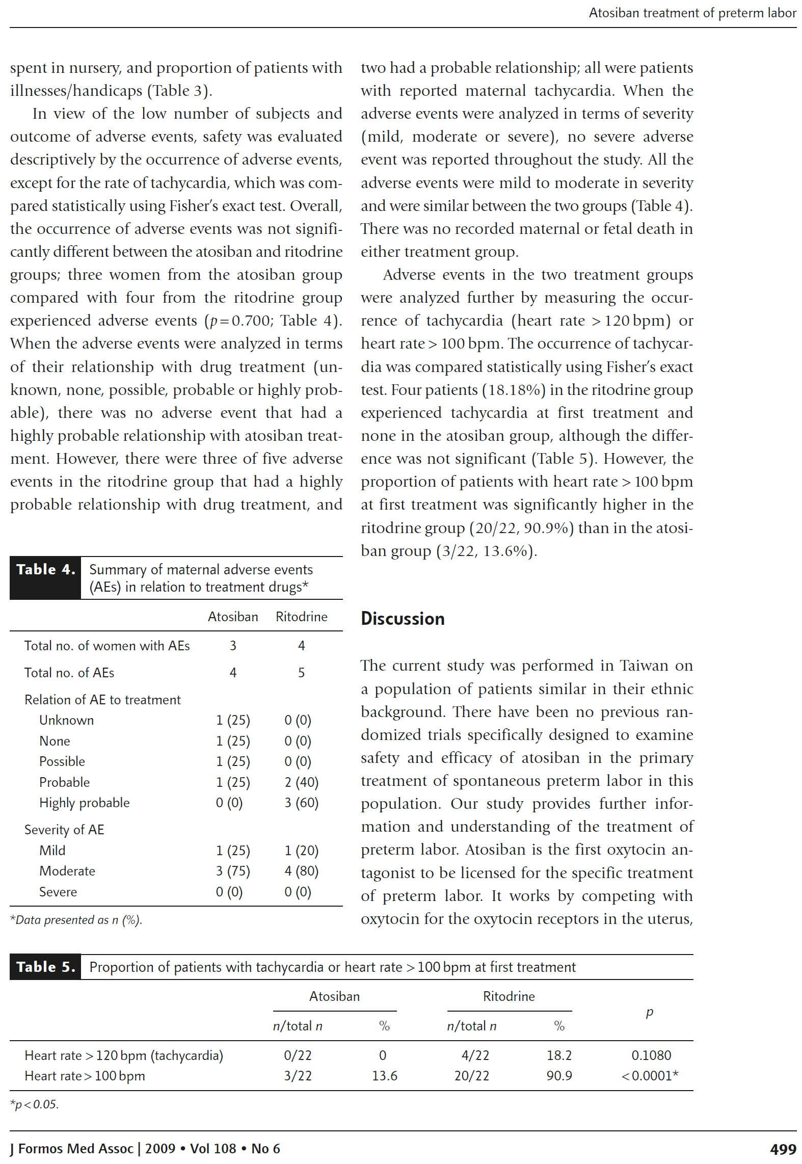 结果:阿托西班组和利多君组在7天内未分娩和不需要替代性生育力治疗的妇女人数相似。没有严重的不良事件,但是母体心血管不良事件,特别是心动过速,在接受利托君治疗的妇女中发生率明显高于对照组(0%阿托西班vs.18.18%利妥君,p < 0.05)。两种药物在新生儿或婴儿结局方面没有差异。