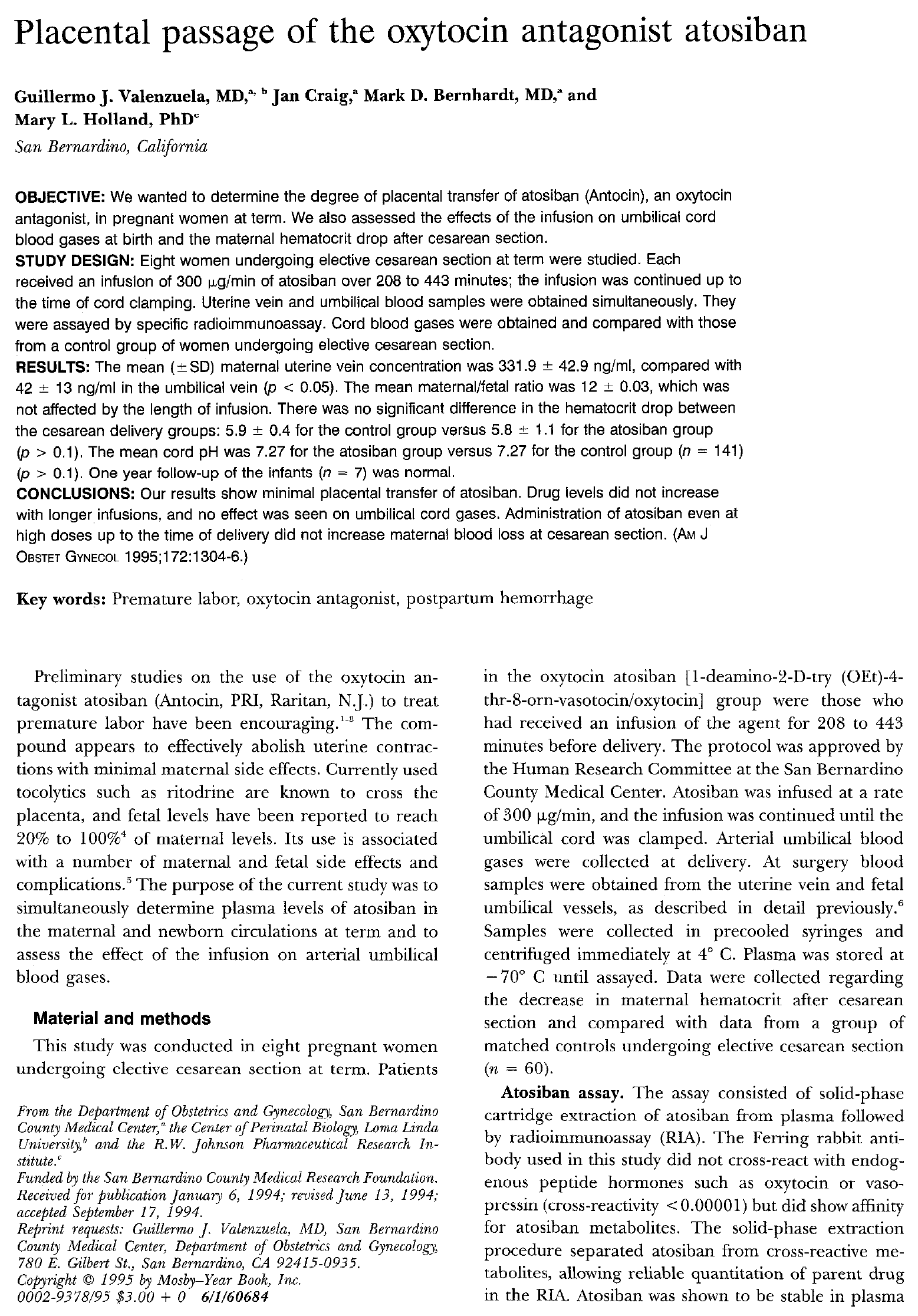 研究设计:对8名择期剖宫产的妇女进行研究。每人接受300ug /分钟的阿托西班注射,持续时间208至443分钟;输注持续到脐带夹住的时候。同时采集子宫静脉血和脐带血,用特异性放射免疫分析法测定,获得脐带血气体,并与接受择期剖宫产的对照组妇女进行比较。