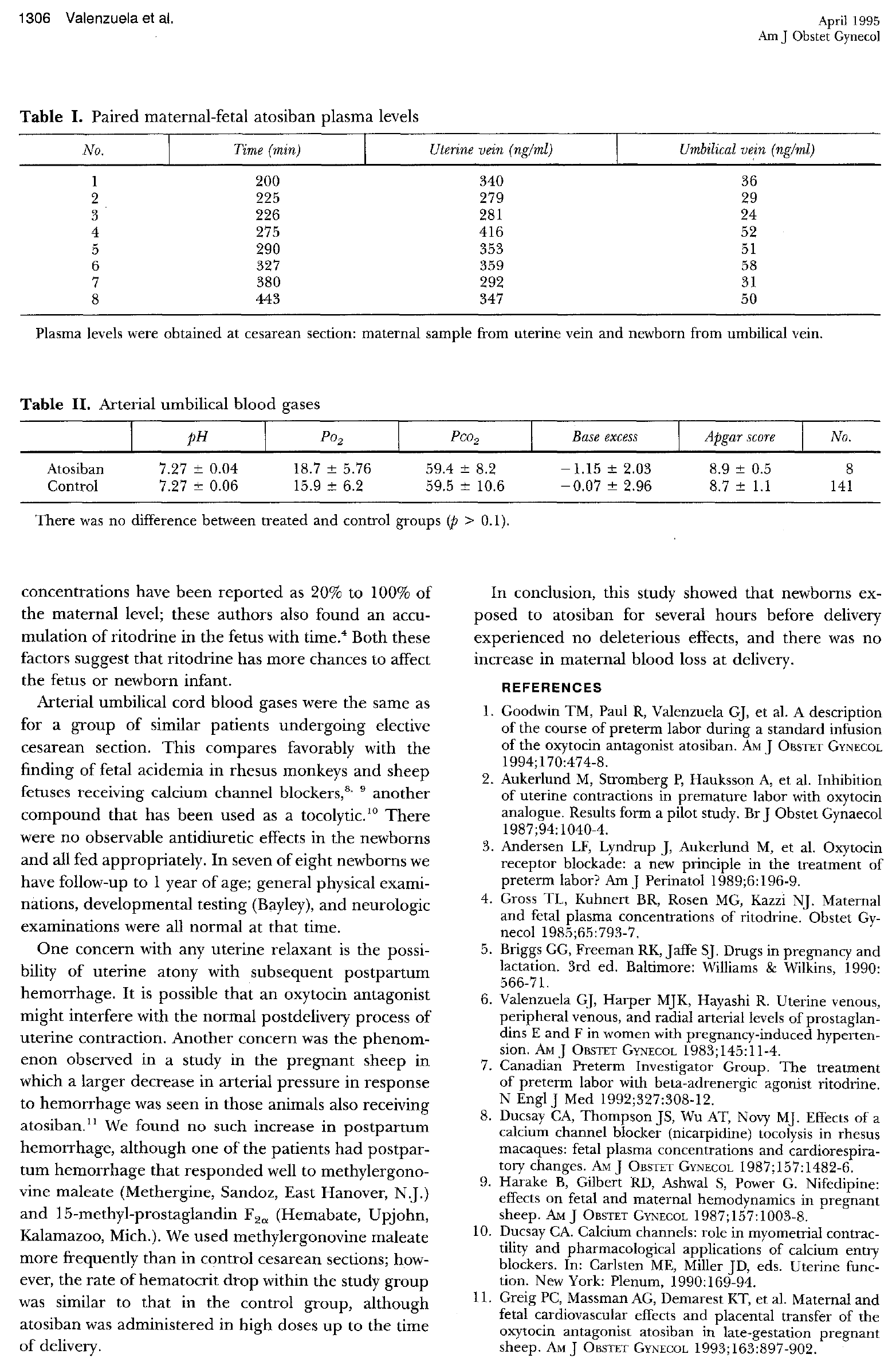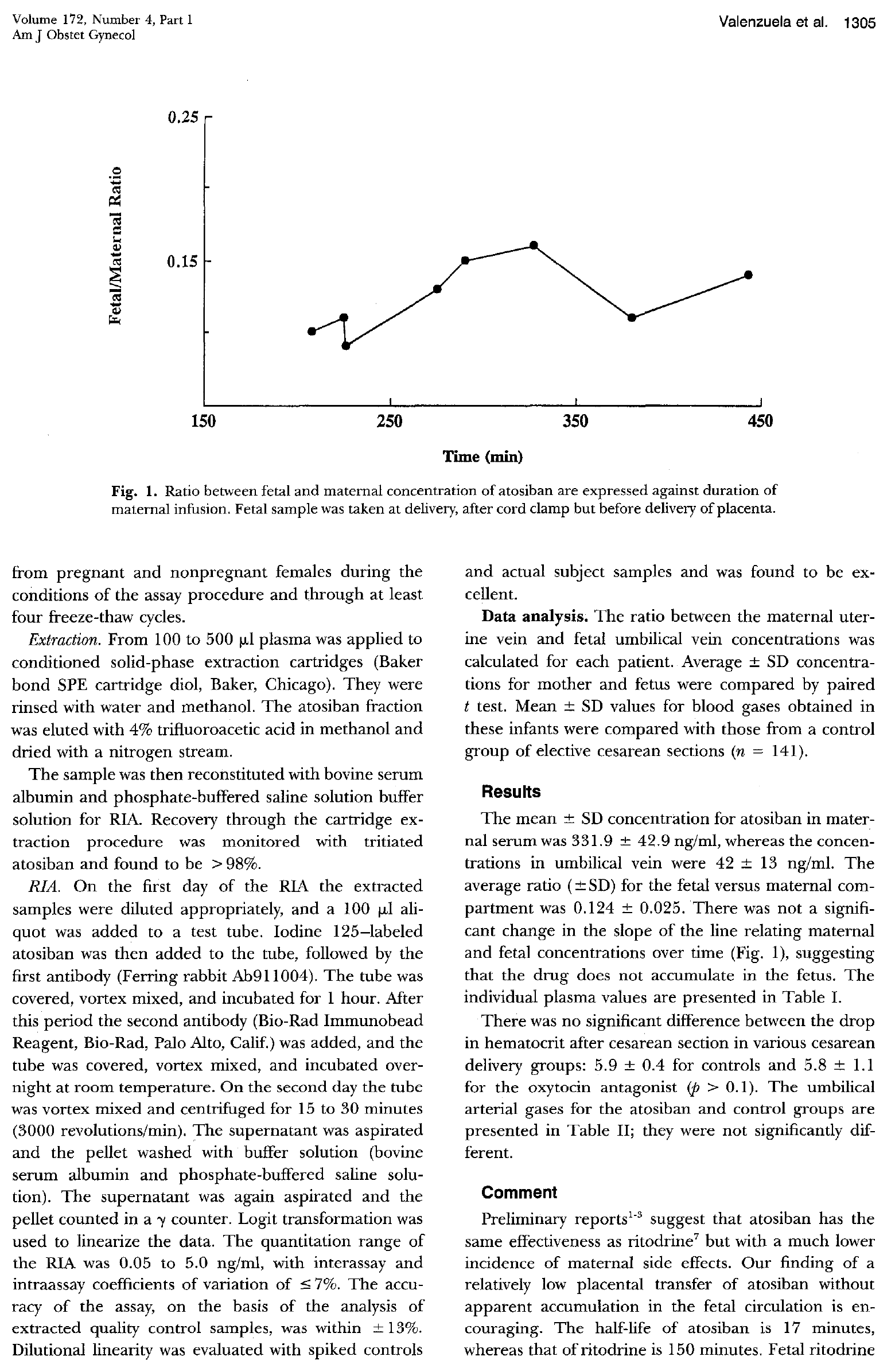 结果:母体子宫静脉血药浓度为331.9±42.9ng/ml,脐静脉血药浓度为42±13ng/ml(o < 0.05)。平均母胎比为12±0.03,不受输液时间的影响。剖宫产组间红细胞压积下降无显著差异:对照组为5.9±0.4,阿托西班组为5.8±1.1 (p> 0.1)。阿托西班组脐带平均pH值为7.27,对照组为7.27(n=141)(p>0.1)。婴儿随访一年均为正常(n=7)。