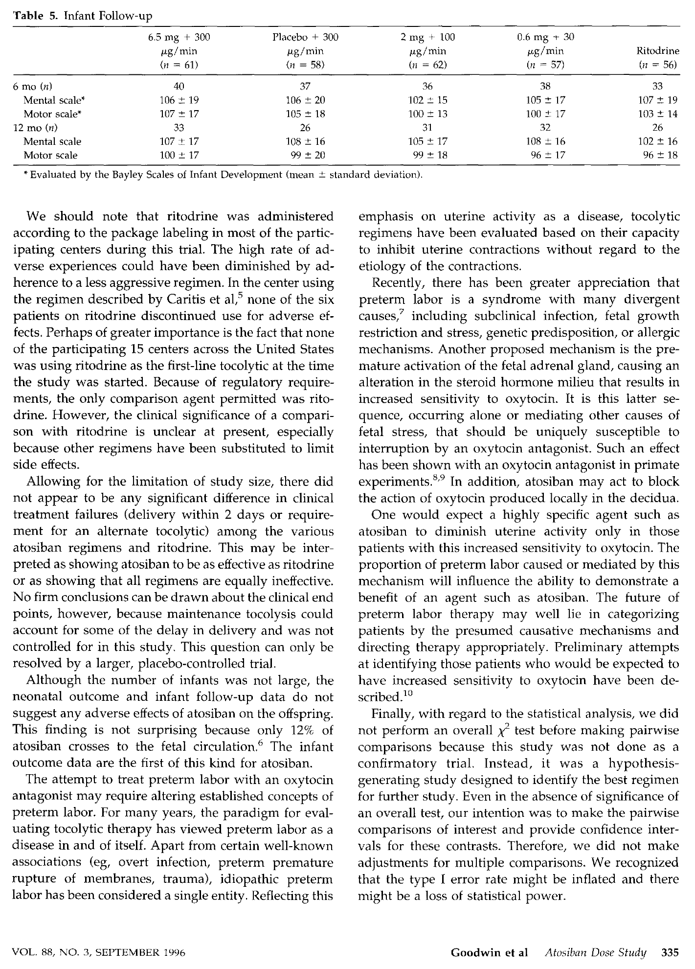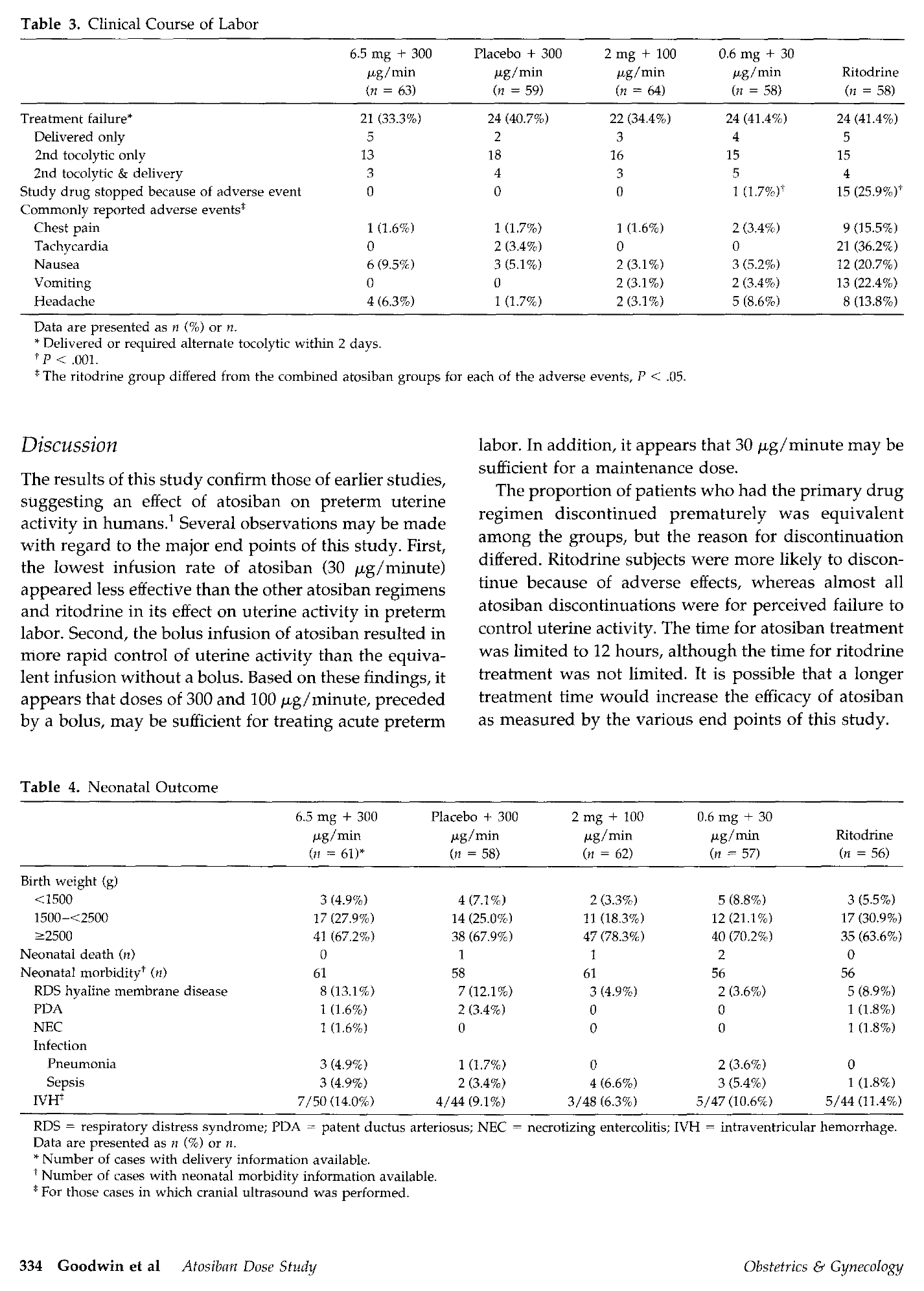 结果:最低剂量的阿托西班(0.6毫克+30微克/分钟)在停止收缩和治疗最后一小时内每小时收缩4次或更少方面明显不如利托君有效。其他阿托西班方案与利托君相当,除了副作用的的停药率。大剂量阿托西班的推注治疗导致在治疗的前2小时内停止收缩的患者比例(63例中的17例)明显高于未接受注射的患者(58例中的6例,P=0.017)。由于副作用,244名阿托西班患者中的1名患者和58名利托君患者中的15名停止使用研究药物。