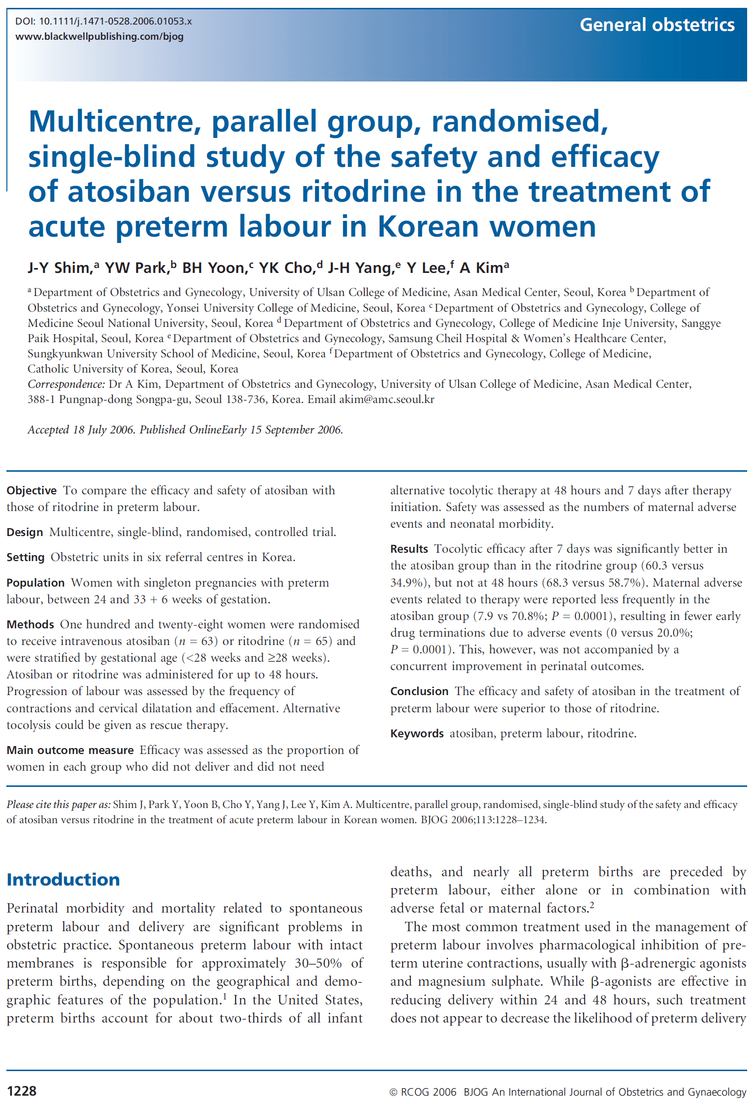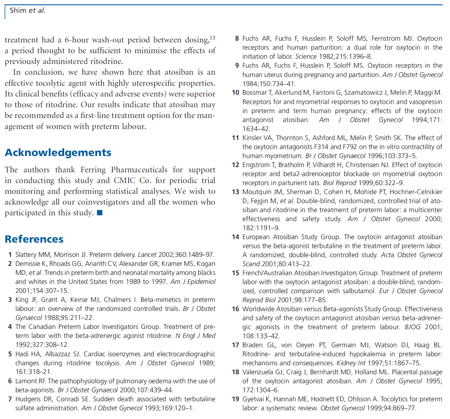 育宁视野丨多中心、平行、随机、单盲研究阿托西班和利托君治疗韩国妇女急性早产的安全性和有效性