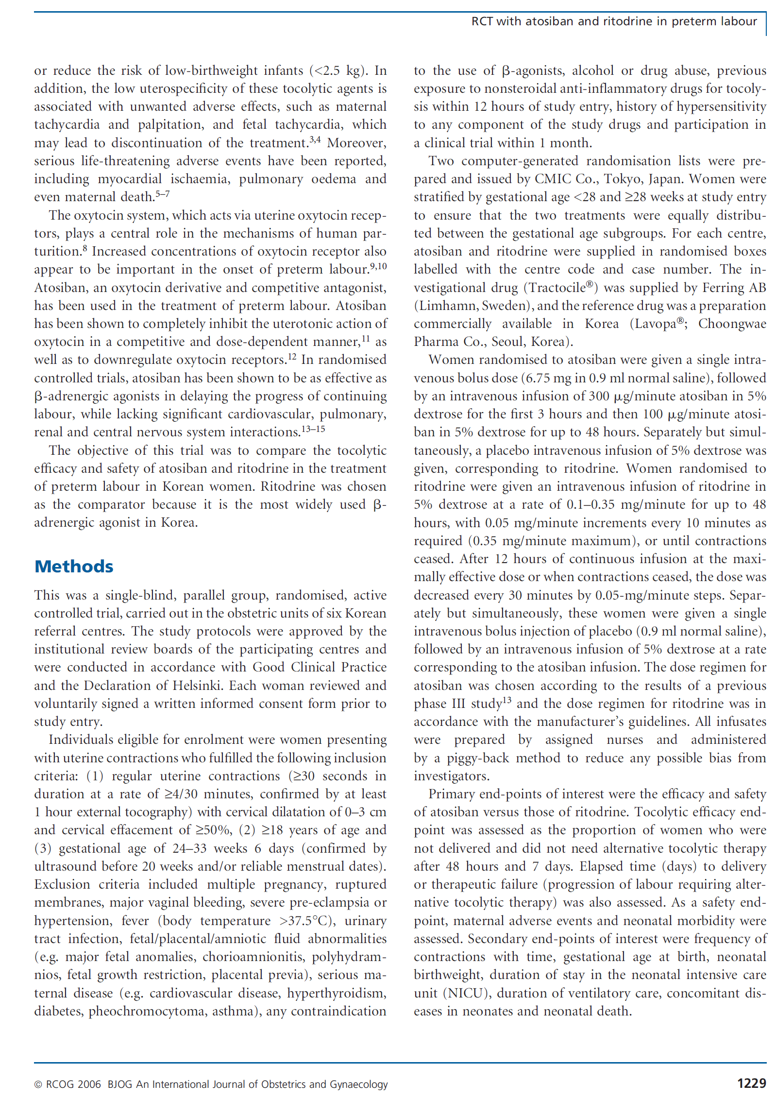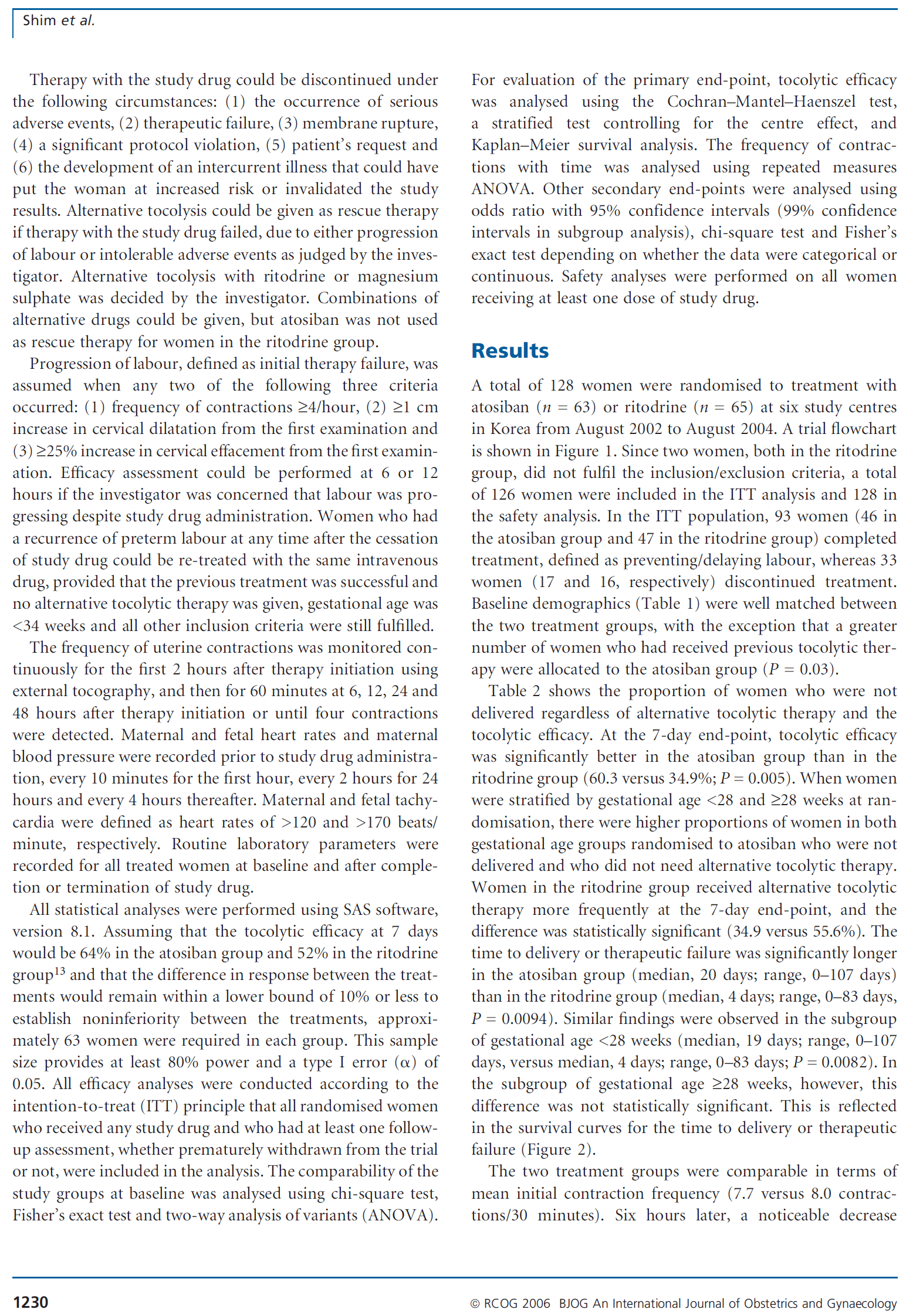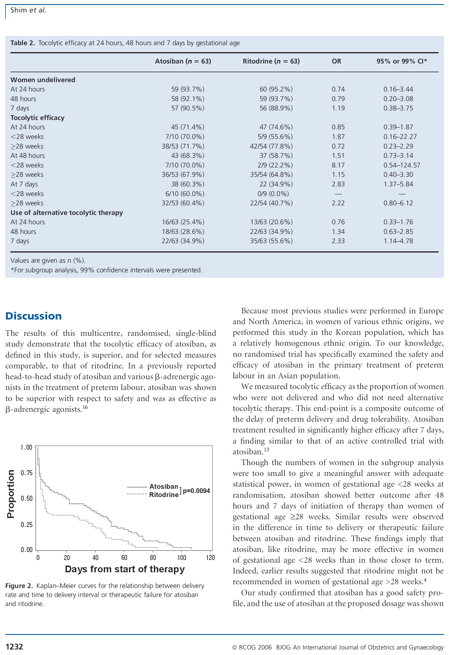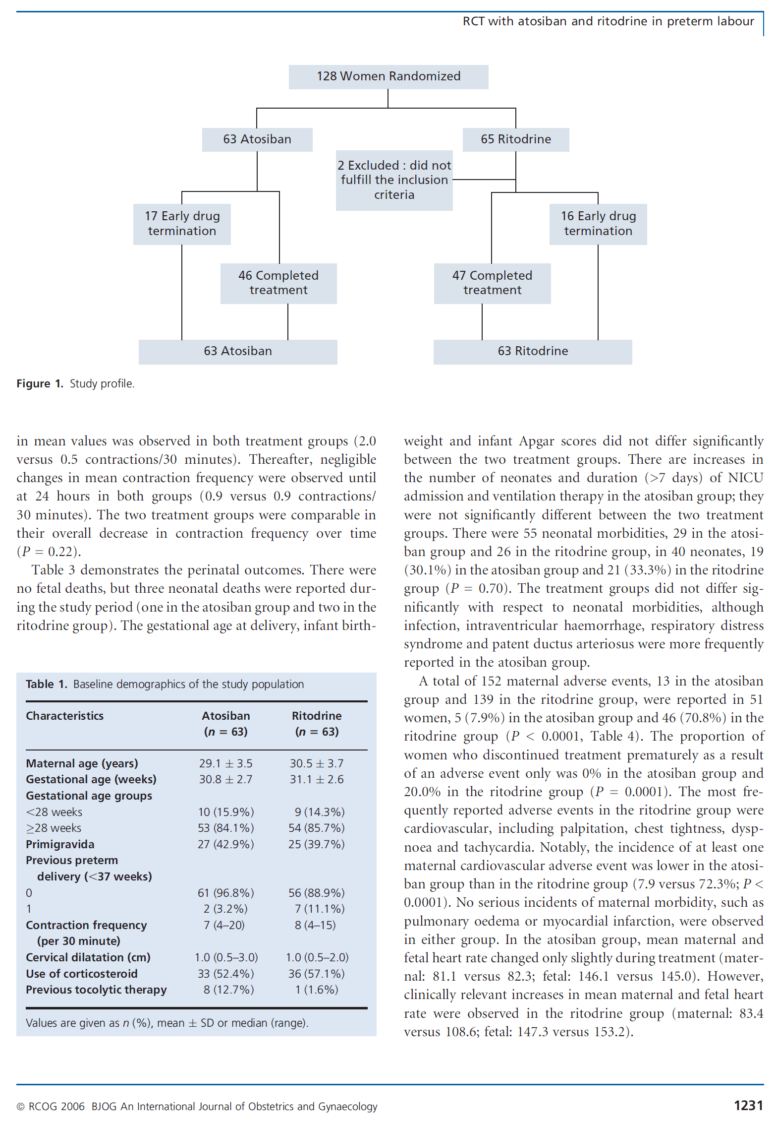 方法:128位女性被随机分配接受静脉内阿托西班(n=63)或利托君(n=65)并按胎龄(< 28周和‡28周)进行分层。通过宫缩的频率,宫颈的扩张和脱落来评估分娩的进展,可以选择其他的宫缩术作为抢救疗法。