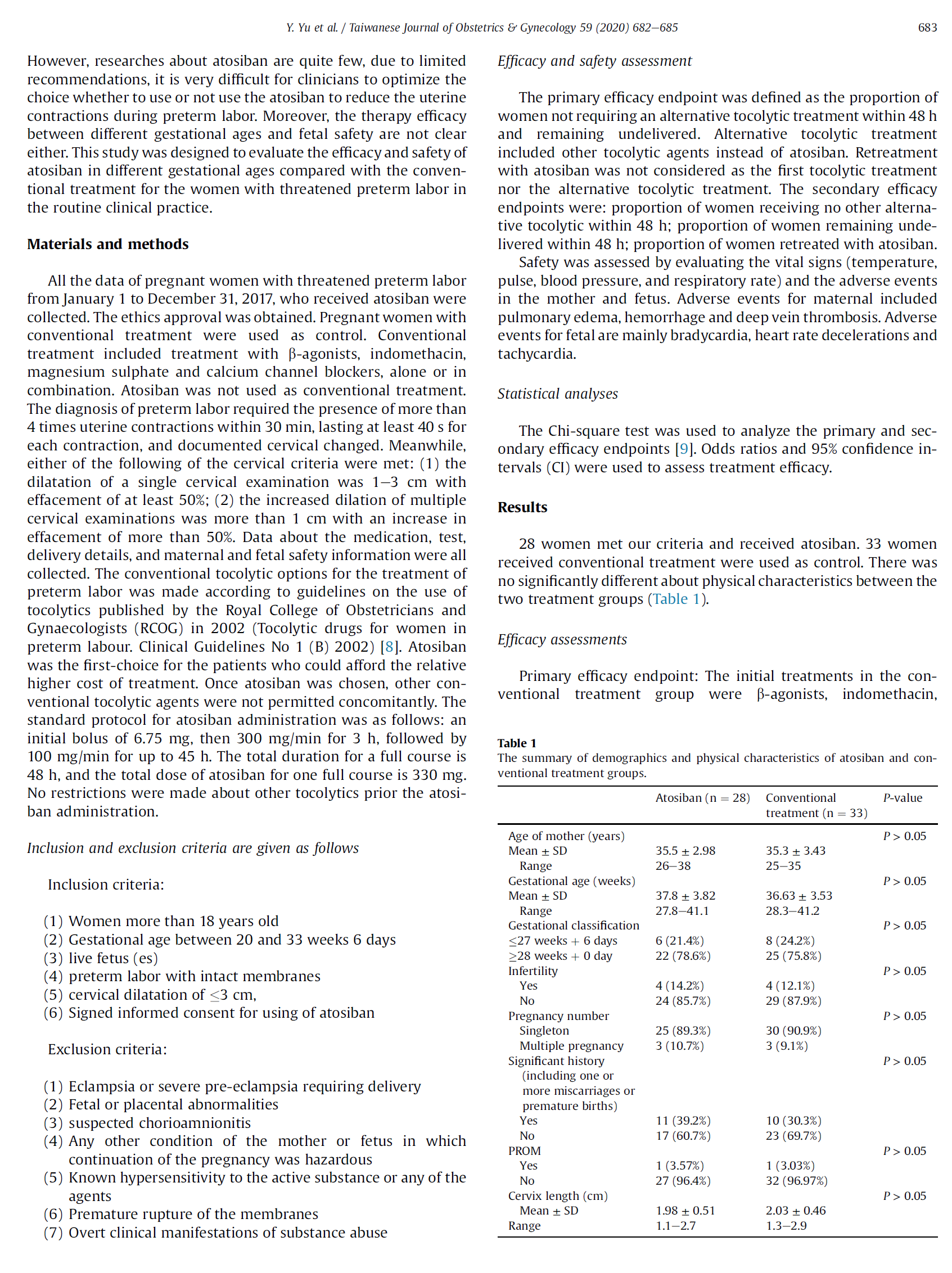 材料和方法:收集2017年1月1日至12月31日接受阿托西班治疗的先兆早产孕妇的所有数据。采用常规治疗(包括β-激动剂、美洒辛、硫酸镁和钙通道阻滞剂,单独或联合使用)作为对照。