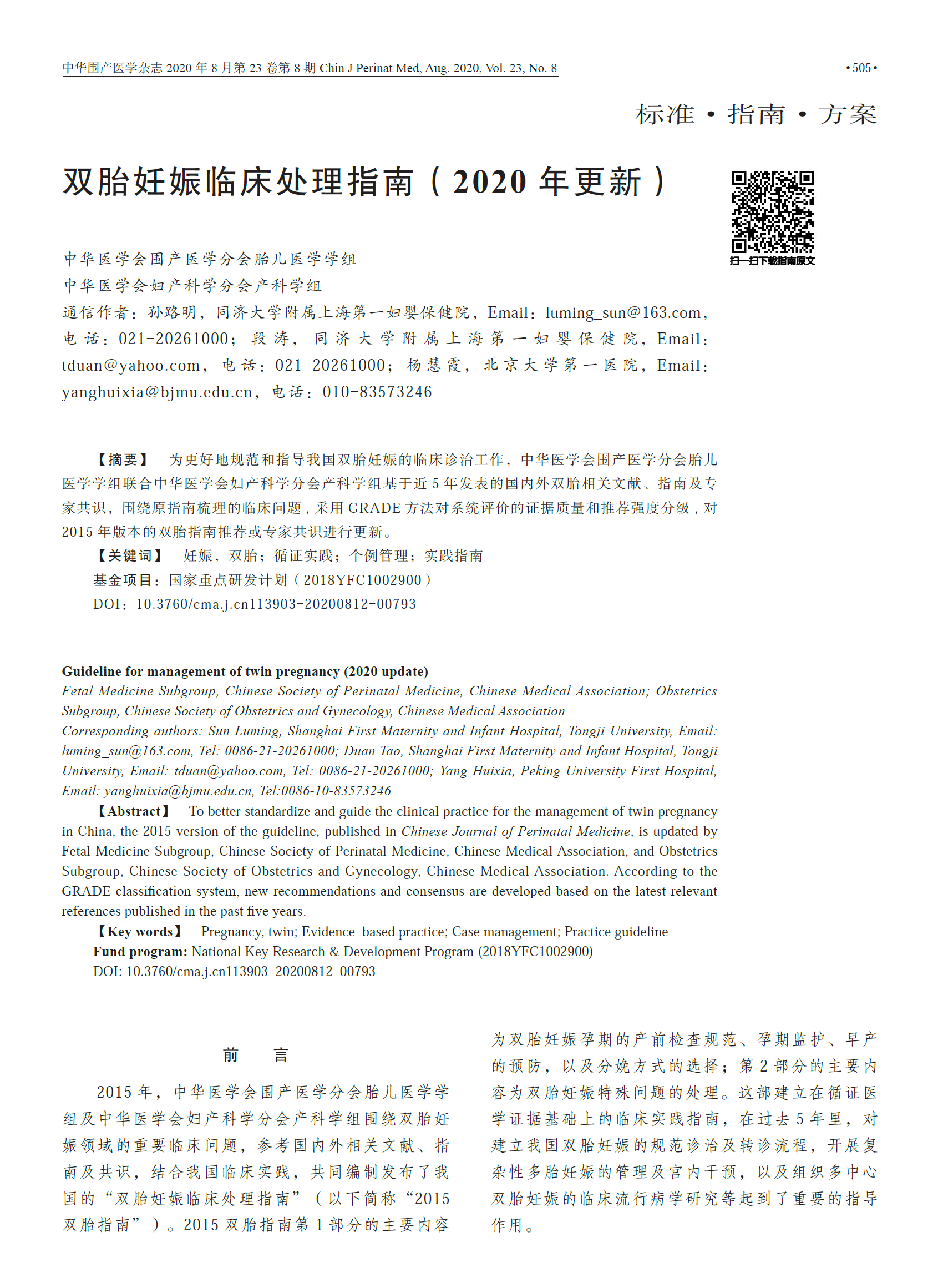育宁关注丨双胎妊娠临床处理指南(2020年更新)