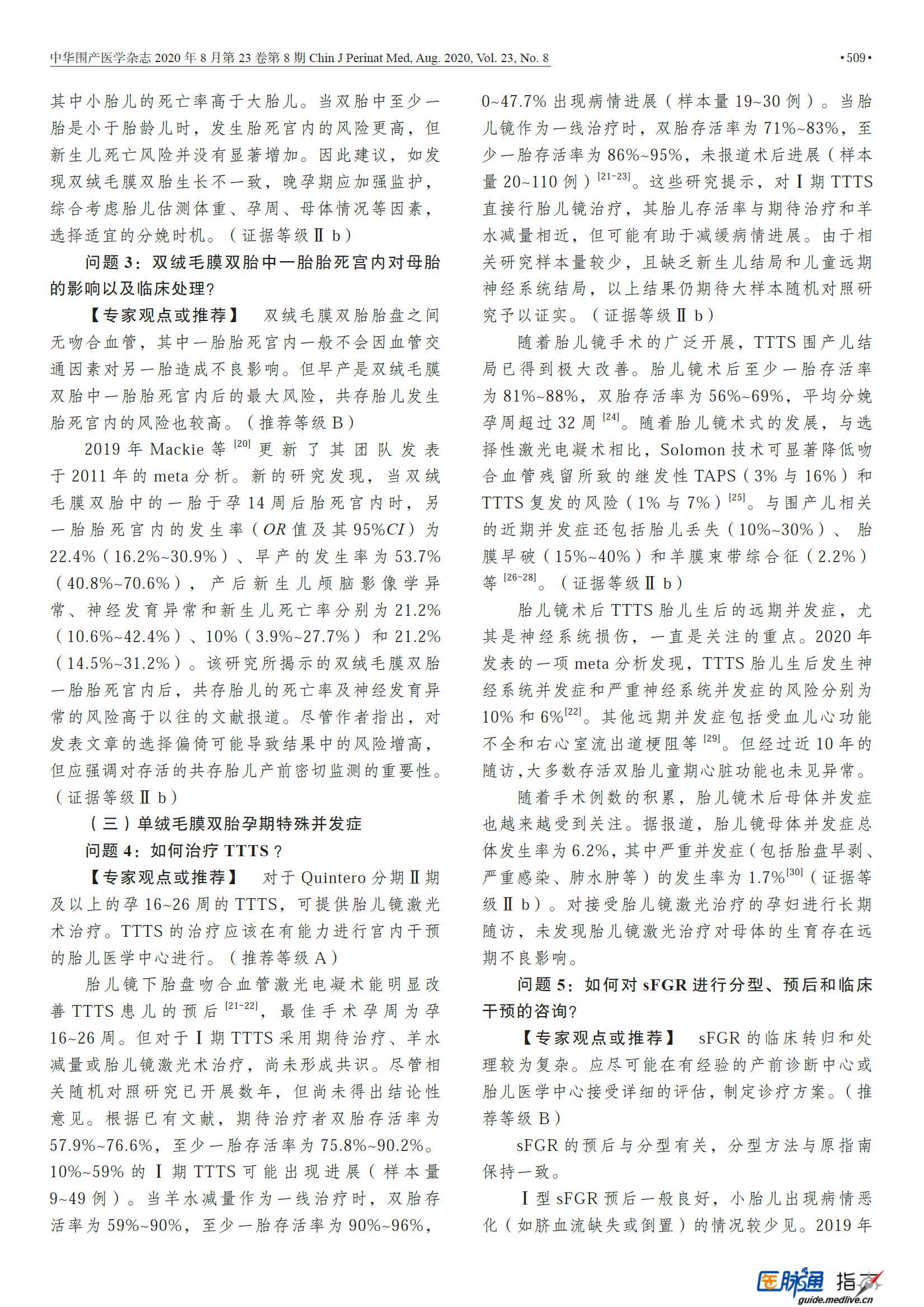 【专家观点或推荐】TAPS 一经诊断,建议每周监测1 次。目前对于TAPS 进行宫内治疗的指征尚无共识。