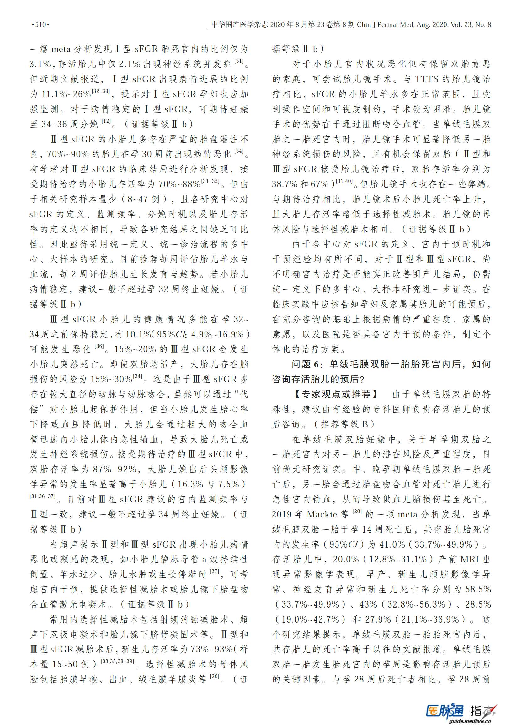 【专家观点或推荐】MCMA 双胎妊娠因为脐带缠绕风险较高,孕期需加强监测。MCMA 双胎的分娩方式以剖宫产为宜,分娩时机以孕32~34 周为宜。(推荐等级 E)