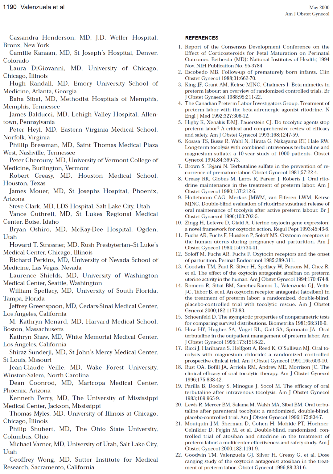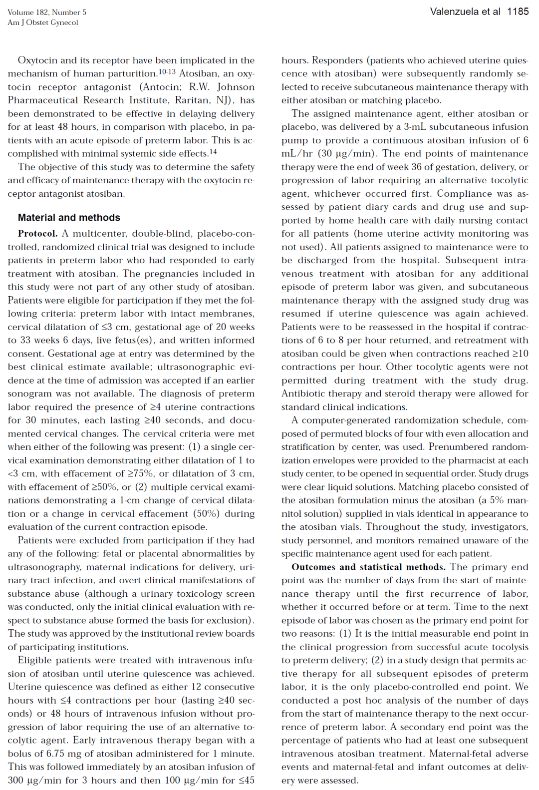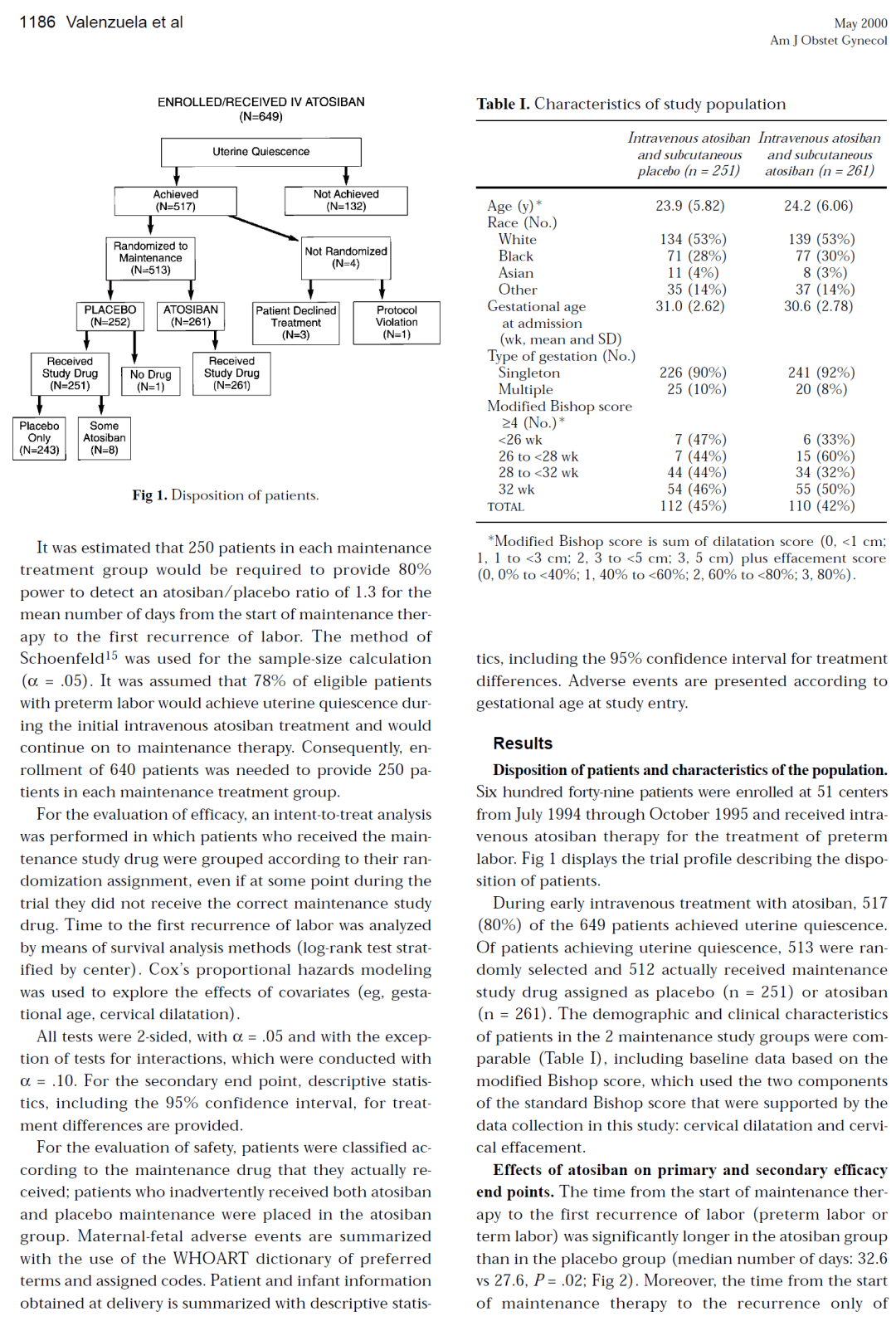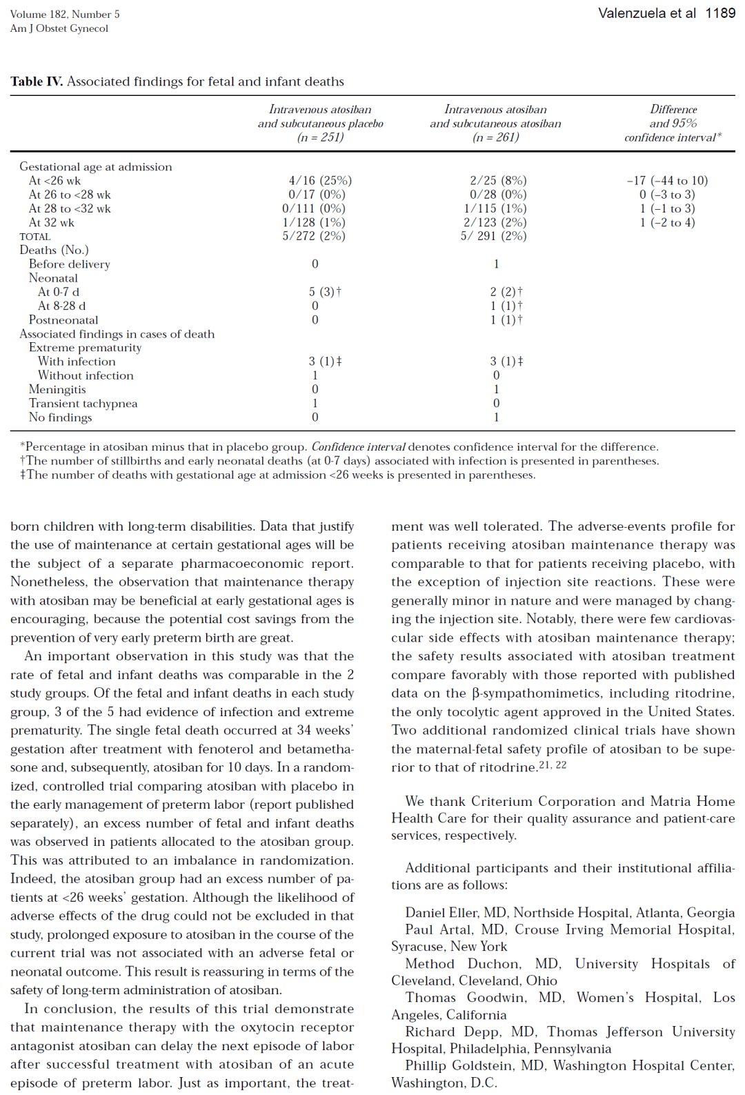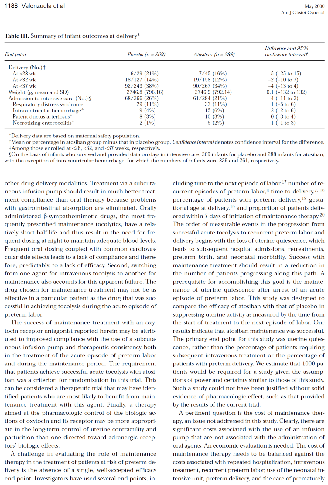 目的: 本研究旨在比较阿托西班与安慰剂的维持治疗在早产妇女静脉注射阿托西班后使子宫平静的疗效和安全性。研究设计: 一项围绕对阿托西班的早期静脉注射有反应的早产患者设计的多中心、双盲、安慰剂对照试验。共有513名患者接受维持治疗,252名患者接受阿托西班维持治疗,251名患者接受安慰剂维持治疗。维持治疗通过泵持续皮下输注30微克/分钟至妊娠36周结束。结果: 阿托西班组可将子宫静息期延长32.6天(中位数),安慰剂组为27.6天(P=.02)。除注射部位反应外,阿托西班和安慰剂的不良事件分布是可比的。婴儿结果(包括出生体重)在维持组和治疗组之间具有可比性。 结论:催产素受体拮抗剂阿托西班维持治疗能延长阿托西班成功治疗早产急性发作后的子宫静息期。治疗耐受性良好。(美国妇产科杂志2000;182:1184-90.)