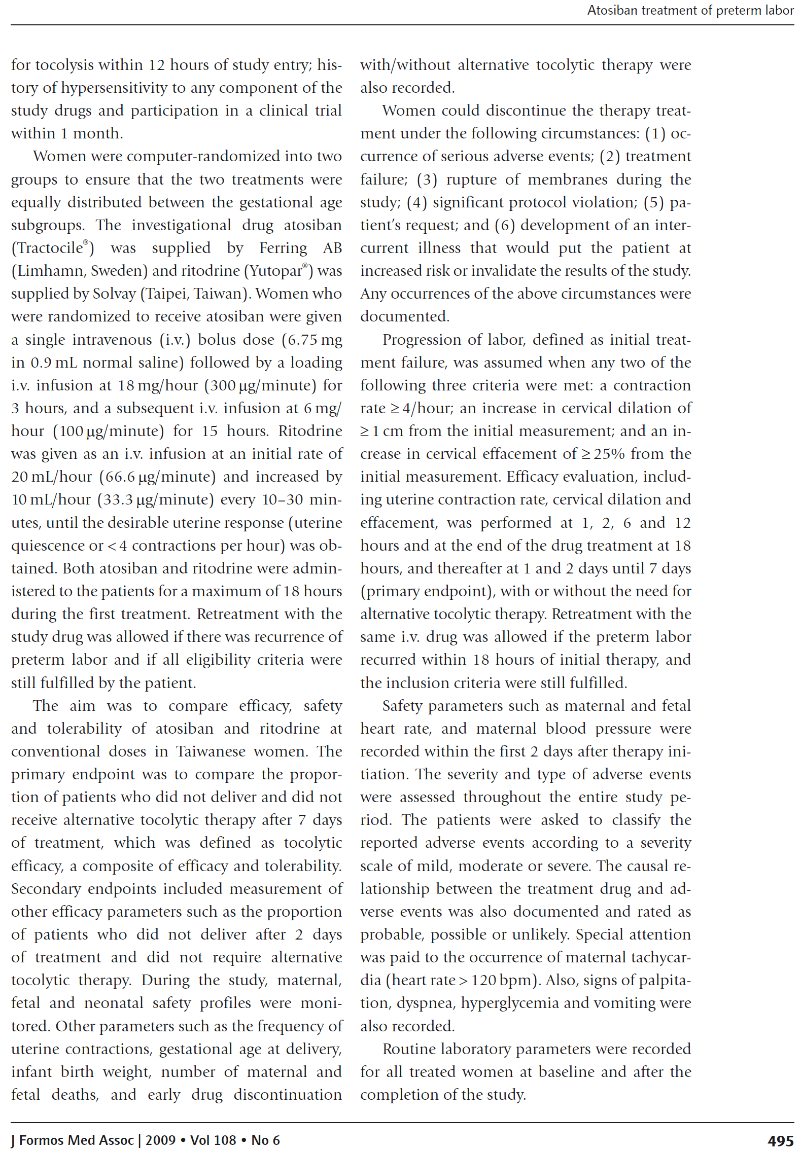 目的:早产的处理包括使用保胎药来抑制早产子宫收缩。本研究的目的是比较静脉注射阿托西班和利托君治疗自发性早产的有效性和安全性。
