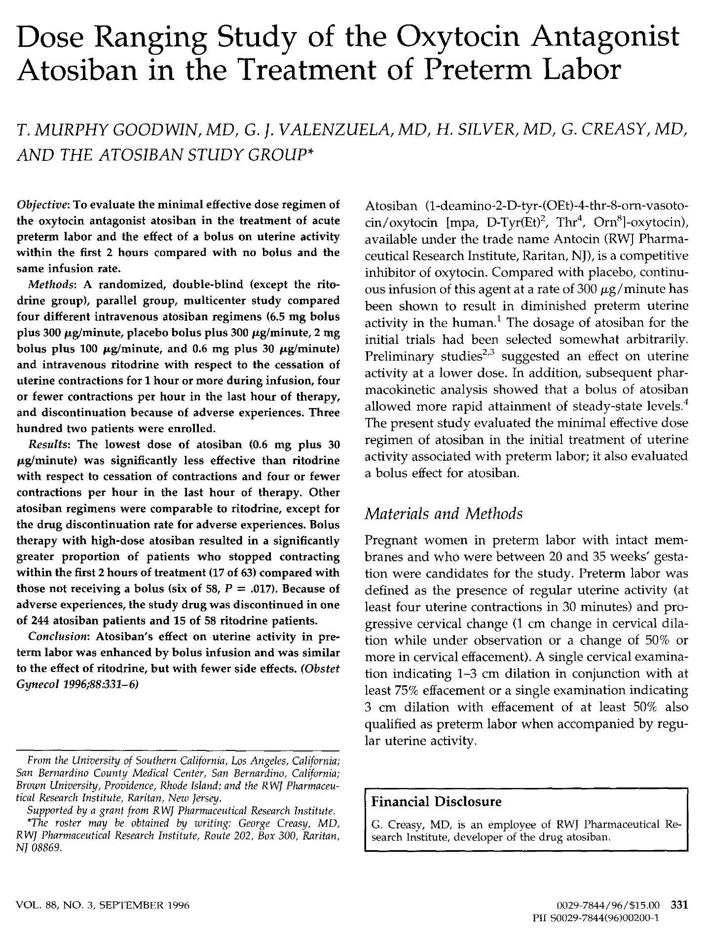 目的:评估催产素拮抗剂阿托西班在治疗急性早产中的最小有效剂量方案,以及与相同输注速度下不给药相比,在头2小时内给药对子宫活动的影响。