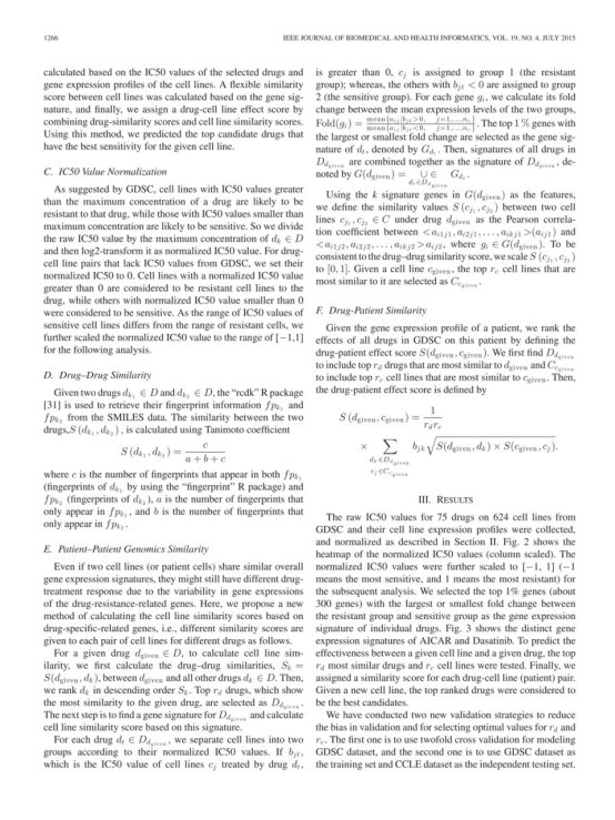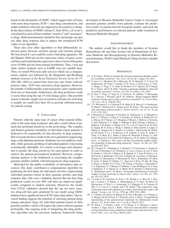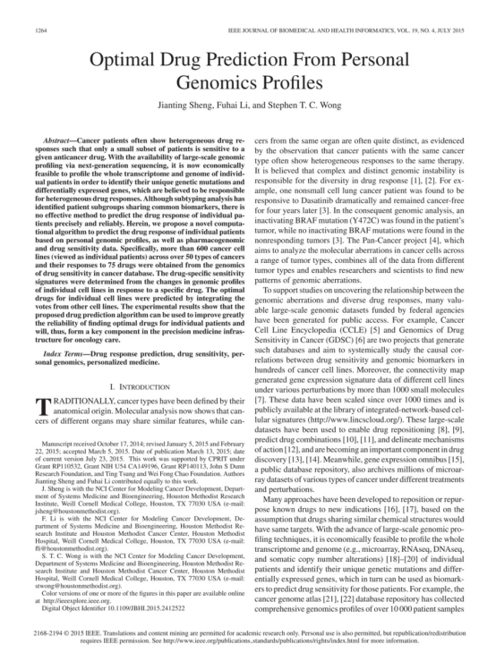 癌症患者往往表现出异质性药物反应,因此只有一小部分患者对特定抗癌药物敏感。随着通过下一代测序进行大规模基因组分析的可用性,现在对单个患者的整个转录组和基因组进行分析以确定其独特的基因突变和差异表达基因在经济上是可行的,这些基因被认为是导致异质性药物反应的原因。虽然亚型分析已经确定了具有共同生物标志物的患者亚组,但没有有效的方法精确可靠地预测个体患者的药物反应。在此,我们提出了一种新的计算算法,根据个人基因组图谱以及药物基因组学和药物敏感性数据预测个体患者的药物反应。具体而言,从癌症数据库中的药物敏感性基因组学中获得了50多种癌症的600多个癌症细胞系(视为个体患者)及其对75种药物的反应。药物特异性敏感性特征是通过单个细胞系对特定药物的反应的基因组图谱变化来确定的。通过整合来自其他细胞系的投票,预测了单个细胞系的最佳药物。实验结果表明,所提出的药物预测算法可以大大提高为个体患者寻找最佳药物的可靠性,从而成为肿瘤治疗精确医学基础设施的关键组成部分。