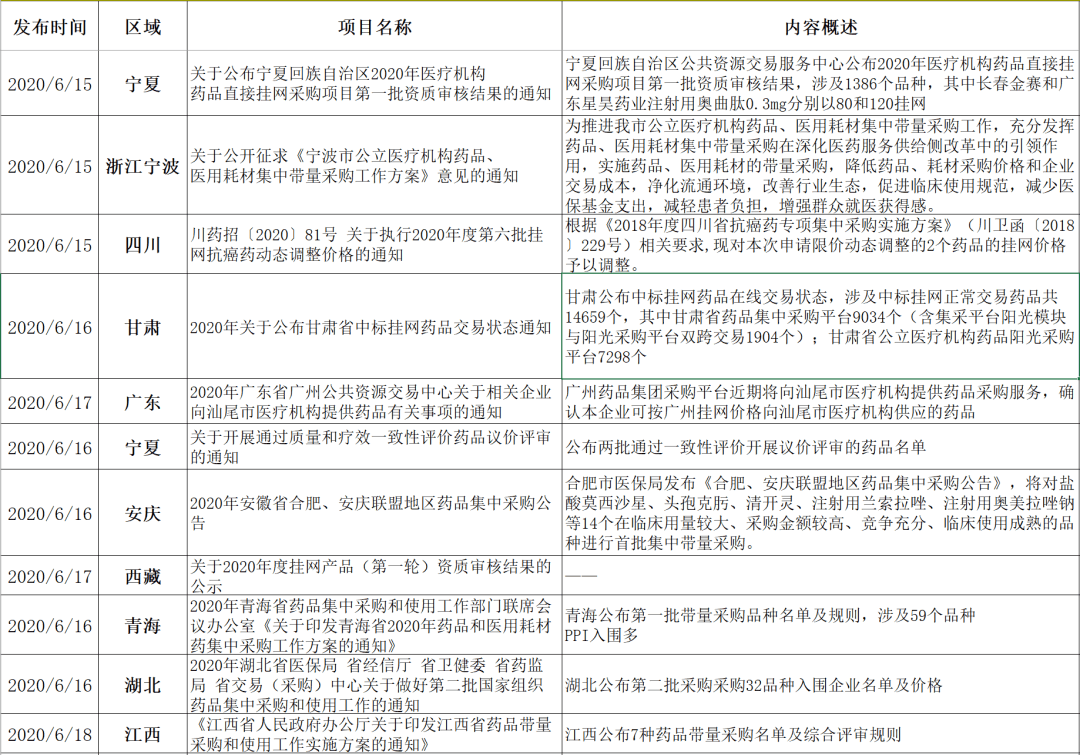 6月15日:宁夏回族自治区公共资源交易服务中心公布2020年医疗机构药品直接挂网采购项目第一批资质审核结果,涉及1386个品种,其中长春金赛和广东星昊药业注射用奥曲肽0.3mg分别以80和120挂网。同日,浙江宁波公开征求《宁波市公立医疗机构药品、医用耗材集中带量采购工作方案》意见。