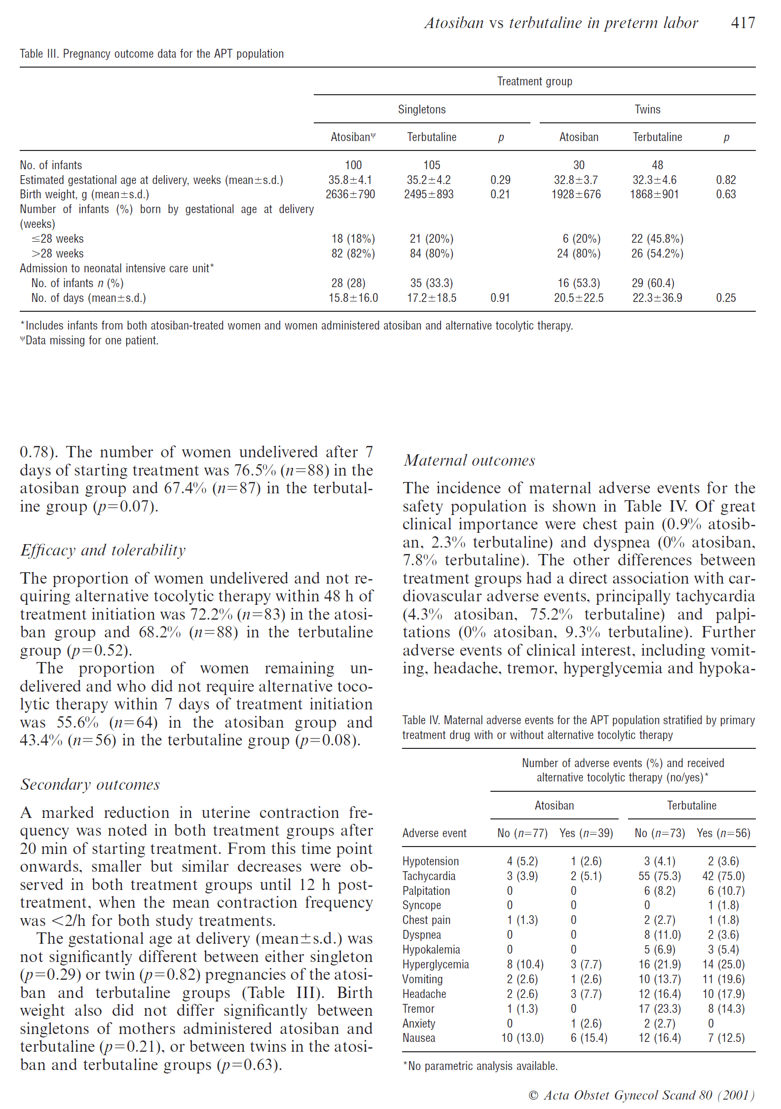 方法:在妊娠23-33周诊断为早产的249名妇女中,有245名接受治疗,116名接受阿托西班治疗,129名接受特布他林治疗。在随机分组中,根据孕龄(≤28周和>28周)对妇女进行分层。阿托西班(静注6.75 mg,300微克/分钟,静注3 小时, 随后100微克/分钟)和特布他林(5- 20微克/分钟)静注13-18小时。允许用研究药物或替代抗宫缩剂重新治疗。抗宫缩疗效是根据48小时和7天后未分娩的妇女的数量来评估的,疗效和耐受性是根据在开始治疗48小时和7天后仍未分娩且不需要替代抗宫缩治疗的妇女的数量来评估的。安全性根据产妇副作用和新生儿发病率进行评估。